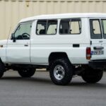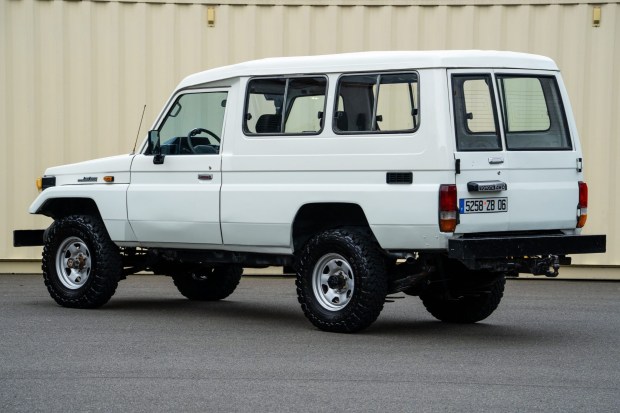 This 1994 Toyota Land Cruiser HZJ75 two-door wagon is a European-market example said to have been imported from Belgium to the US in 2021, and it is described by the consigning dealer as a running and driving project that would benefit from some tinkering. Finished in white over black vinyl upholstery, the truck is powered by a 4.2-liter 1HZ diesel inline-six mated to a five-speed manual transmission and a dual-range transfer case. Equipment includes 16″ steel wheels, manually locking front hubs, front disc brakes, a winch, trailer hitches, an intake snorkel, a split rear cargo door, aftermarket steel bumpers …