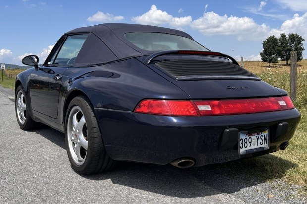 This 1995 Porsche 911 Carrera cabriolet was first registered in California and spent time in Texas prior to the seller’s purchase in 2017, and it now shows 45k miles. Powered by a 3.6-liter flat-six paired with a six-speed manual transaxle, the car is finished in Midnight Blue Metallic over Cashmere Beige leather upholstery. Equipment includes a blue soft top, 17″ Cup II wheels, a speed-activated rear spoiler, cruise control, an aftermarket stereo, a HiFi sound system, power-adjustable front seats, and air conditioning. This 993 Carrera cabriolet is offered with a clean Carfax report and an Arkansas title in the sell …