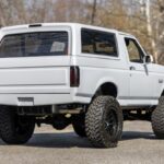 This 1996 Ford Bronco was stripped to the frame and rebuilt, which included refinishing the body in custom Avalanche Gray and installing a 5.0-liter Coyote V8 linked with a six-speed automatic transmission and a dual-range transfer case. Additional equipment includes a 2021 Ford Super Duty-sourced front bumper, a rear roll pan, smoked aftermarket lighting, RealTruck power-retractable running boards, 20″ Fittipaldi wheels, a 4″ lift kit, Fox shocks, power-adjustable Nissan Titan-sourced front seats, black and dark grey Alea leather and Alcantara upholstery, and a Pioneer stereo. The selling dealer acquired the truck in 2026 and it is no …