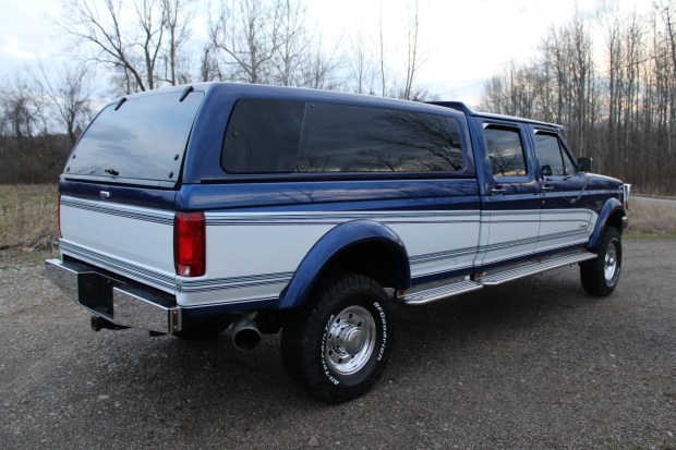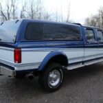 This 1996 Ford F-350 XLT is a Crew Cab 4×4 pickup that was modified when new by Centurion, and it is finished in Deep Blue Metallic with multi-color accents over a gray leather interior with wood trim. Power is provided by a turbodiesel 7.3-liter Power Stroke V8 linked to a four-speed automatic transmission and a dual-range transfer case, and it is equipped with 16″ alloy wheels, automatic locking front hubs, and front disc brakes. Additional details include a Leer camper shell, a sun visor, illuminated running boards, a bed liner, a grille guard, a power-adjustable driver’s seat, air conditioning, crui …