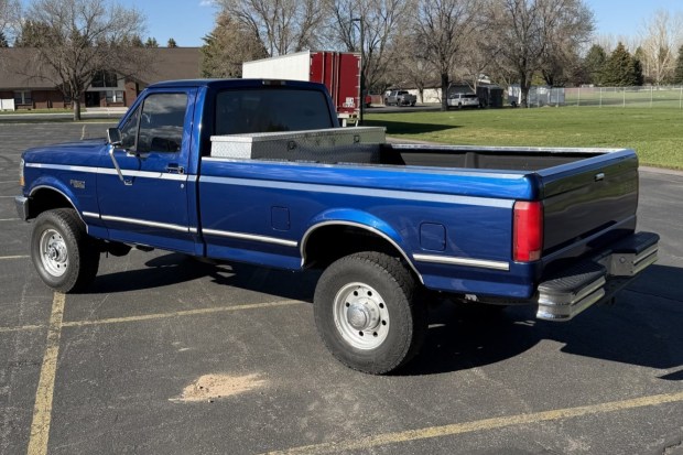 This 1997 Ford F-250 XL 4×4 is a regular cab long-bed pickup that spent much of its life in Utah and now has 112k miles. It is finished in Royal Blue Metallic over Opal Gray vinyl and powered by a 7.5-liter Lima V8 linked to a four-speed automatic transmission and a dual-range transfer case. Equipment includes 16″ eight-hole alloy wheels, a locking toolbox, a Power Acoustik head unit, a Kicker subwoofer, cruise control, air conditioning, dual fuel tanks, and a Flowmaster muffler. Purchased by the seller in 2026, this F-250 is offered at no reserve with a clean …