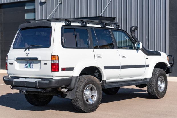 This 1997 Toyota Land Cruiser Collectors Edition was purchased by the seller in 2022 and was fitted with a 5.9-liter Cummins turbodiesel inline-six under current ownership. Finished in Natural White over Oak leather, the truck is also equipped with a four-speed automatic transmission, a dual-range transfer case, a locking center differential, 16″ alloy wheels, a 2″ Old Man Emu lift kit, an ARB front bumper, a Warn winch, an air-intake snorkel, a receiver hitch, a roof rack, and a Pioneer stereo. This FZJ80 is offered at no reserve with a clean Carfax report and a clean Oregon title in the seller’s name.