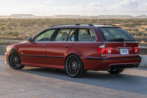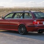 This 1999 BMW 540i Sport Wagon is powered by a 4.4-liter M62 V8 paired with a six-speed manual gearbox that was installed in place of the factory automatic transmission under prior ownership. Finished in Siena Red Metallic over a Sand Beige interior, the car has been further modified with an ECU tune, aftermarket exhaust components, 20″ Style 32 wheels, KW coilovers, M5 and Dinan bodywork, xenon headlights, LED exterior and interior lighting, Recaro front seats, and an M-branded steering wheel and shift knob. Additional equipment includes a sunroof, factory premium audio, and dual-zone autom …