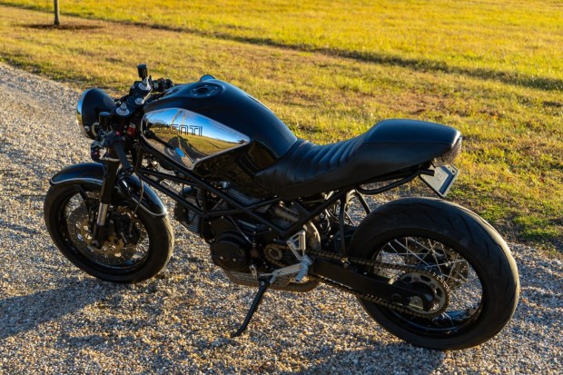 This 1999 Ducati Monster 900 was modified in the style of a cafe racer circa 2013, and the seller states that it was previously owned by musician Albert Hammond Jr., guitarist for the rock band The Strokes. Acquired by the current owner in 2025, the motorcycle is finished in black with white-outlined polished sections. Power is provided by an air-cooled 904cc SOHC L-twin that was rebuilt with oversized cylinders and 94mm Wiseco pistons as part of the build, and equipment includes a six-speed transmission, two Keihin FCR 41 carburetors, K&N pleated pod-style air filters, a tw …