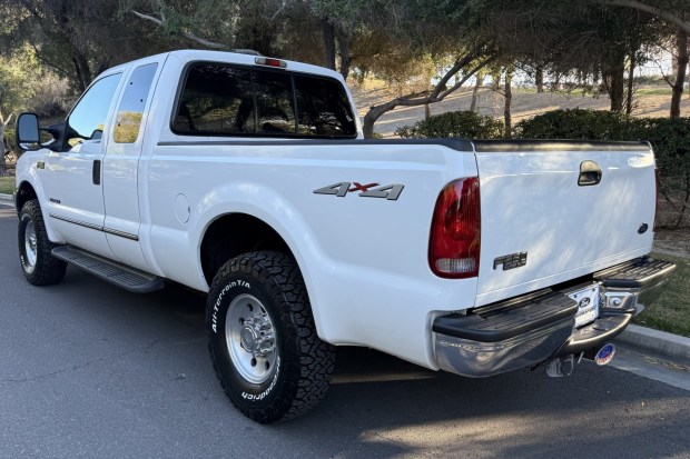 This 1999 Ford F-250 Super Duty XLT is a SuperCab short-bed 4×4 pickup that is said to have remained under the care of a single owner for 24 years in Arizona, and it shows 115k miles. Power is provided by a 7.3-liter Power Stroke turbodiesel V8 linked with a four-speed automatic transmission and a dual-range transfer case. The truck is finished in Oxford White Clearcoat over Graphite cloth. It features running boards, telescoping trailer mirrors, a sliding rear window, a receiver hitch, a LineX bed liner, 16″ eight-hole alloy wheels, Firestone Airstroke rear airbags, and …