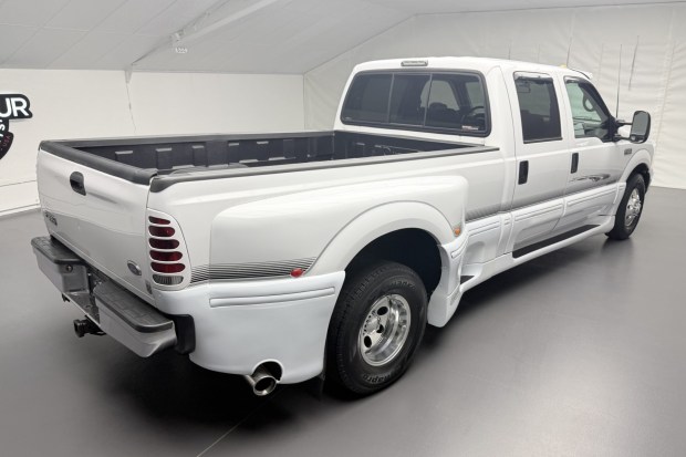 This 1999 Ford F-350 Super Duty XLT is a Crew Cab long-bed dually pickup that was modified by Eclipse Conversions with the Sport Truck package, which added a painted grille and taillight covers, a cab visor, ABS lower bodywork, walnut interior trim, and gray and black leather seat upholstery. Finished in Oxford White, the truck is powered by a 7.3-liter Power Stroke turbodiesel V8 that drives the rear wheels through a four-speed automatic transmission and a limited-slip differential. Additional equipment includes clearance lights, 16″ Ion Alloy 167 wheels, four-wheel disc brakes, …