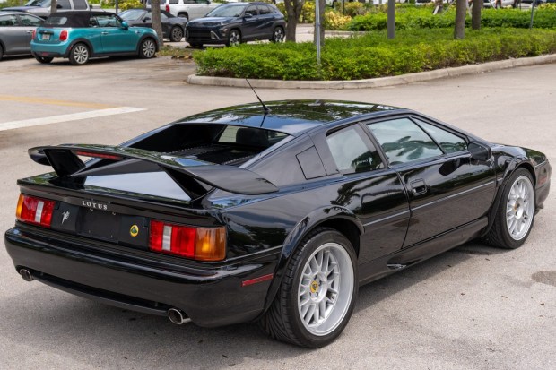This 1999 Lotus Esprit V8 is one of approximately 150 examples produced for the model year. It is finished in black over black leather and is powered by a twin-turbocharged 3.5-liter V8 paired with a five-speed manual transaxle. Modifications include an aftermarket ECU, HKS blow-off valves, a MOMO steering wheel, and a Remus exhaust system with high-flow catalytic converters, while factory equipment includes a glass roof panel, pop-up headlights, 17″ and 18″ OZ Monoblock Nova wheels, air conditioning, and an aftermarket Alpine stereo. The seller acquired the car in 2012, and work performed in preparation for the sale included flushing the coolant, recharging the air …