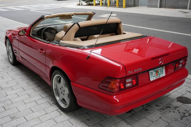 This 1999 Mercedes-Benz SL500 has 44k miles, and it is said to have resided at the prior owner’s Florida vacation home. The car was ordered with the SL1 Sport Package, which added AMG lower styling for the Magma Red-finished bodywork as well as 18″ five-spoke AMG wheels and fog lights. Powered by a 5.0-liter V8 paired with a five-speed automatic transmission, the car also has a body-color removable hardtop, a black soft top, headlight wipers, Java Nappa leather-trimmed power-adjustable seats with memory settings, and a Bose sound system. This R129 is now offered in Florida …