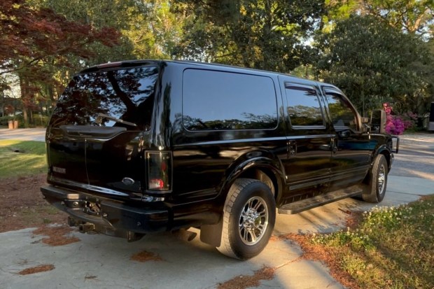 This 2001 Ford Excursion Limited was purchased by the seller in June 2020, and subsequent work included rust repair to the roof and a repaint in black. It is powered by a 7.3-liter Power Stroke turbodiesel V8 linked with a four-speed automatic transmission, and modifications include a Mishimoto radiator and transmission cooler, and an XPD intercooler. The drive belt assembly, starter motor, and various speed and temperature sensors were replaced under current ownership. Equipment includes 18″ steel wheels, a brush guard, an LED light bar, upgraded towing mirrors, running boards, rear parking sensors, and a receiver hitch. Medium Parchment lea …