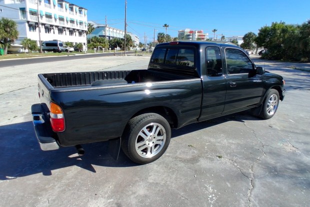 This 2003 Toyota Tacoma Xtracab has remained registered in Florida since new and was purchased by the seller in 2008. It has been refinished in Black Sand Pearl over Charcoal cloth and is powered by a 2.4L 2RZ-FE inline-four that drives the rear wheels through a five-speed manual transmission. Equipment includes 17″ split-spoke alloy wheels, front disc brakes, air conditioning, and a Pioneer Bluetooth stereo. This Tacoma has 273k miles and is offered at no reserve with a handwritten service log, a clean Carfax report, and a clean Florida title in the seller’s name.