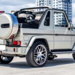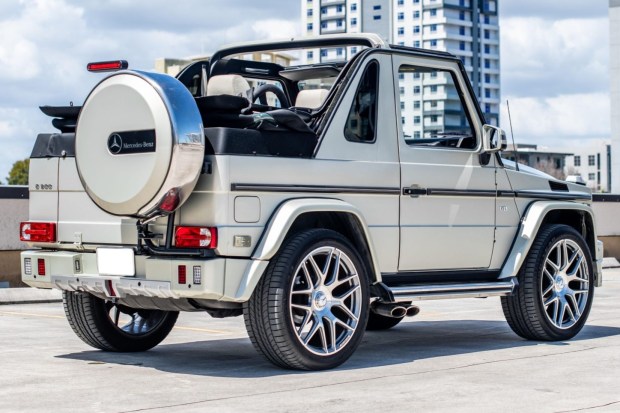 This 2004 Mercedes-Benz G500 cabriolet spent time in Germany, and it was imported to the US in 2004 and subsequently federalized by J.K. Technologies of Baltimore, Maryland. The Designo Silver Metallic truck was altered with later-model-style bodywork, front and rear parking sensors and cameras, and aftermarket lighting, and the cabin was re-trimmed in cream beige and black upholstery. Power is provided by a 5.0-liter V8 fitted with a side-exit exhaust system and linked with a five-speed automatic transmission, a dual-range transfer case, and three locking differentials. Additional equip …