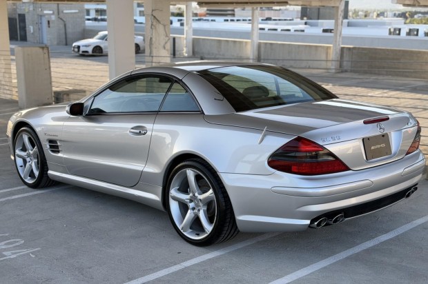 This 2004 Mercedes-Benz SL55 AMG was specified in Brilliant Silver Metallic over gray leather, and it has spent most of its time registered in California. Power is from a supercharged 5.4-liter V8 paired with a five-speed automatic transmission, and equipment includes a power-retractable hardtop, bi-xenon headlights, 19″ Lorinser five-spoke wheels, Keyless Go keyless entry, heated multi-contour seats, a Bose sound system, and COMAND with navigation. This R230 has 112k miles and is now offered by the selling dealer at no reserve with owner’s manuals and a clean California title.