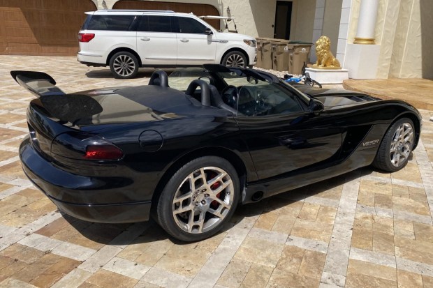This 2008 Dodge Viper SRT-10 is a black-over-black roadster that has been registered in Texas, Quebec, and Florida from new. It has 28k miles, 21k of which have been added since the car was purchased by the seller in June 2010. Power is from an 8.4-liter V10 paired with a six-speed manual transmission, and equipment includes a limited-slip differential, a rear wing, a black convertible soft top, HID headlights, side-exit exhaust outlets, 18″ and 19″ H-spoke alloy wheels, aftermarket seats, dual roll hoops, and a CD stereo. This Viper SRT-10 roadster is now offered with a clean Florida title in the n …