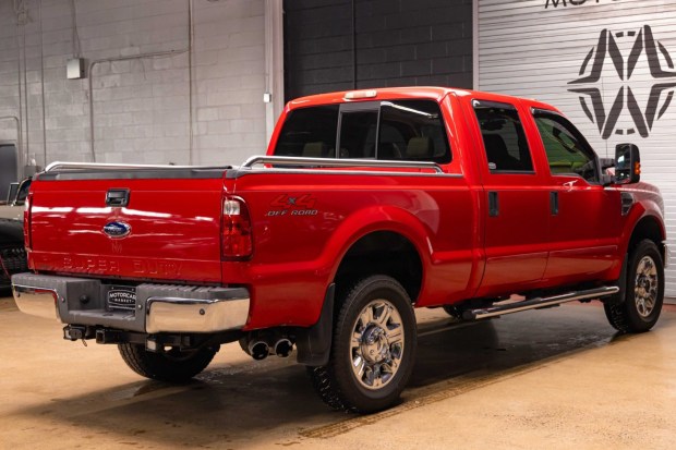 This 2008 Ford F-350 Lariat is a Crew Cab 4×4 pickup that has 65k miles and is powered by a 6.4-liter Power Stroke turbodiesel V8 linked with a five-speed automatic transmission, a dual-range transfer case, and a limited-slip rear differential. Finished in Red over Camel leather, the truck was optioned with the 4×4 Off-Road, High-Capacity Trailer Tow, TowCommand, Driver Memory, and Rear-Seat DVD Entertainment packages. Additional equipment includes a Keystone Restyling Good Hood, a power sunroof, a soft roll-up tonneau cover, 20″ seven-spoke wheels, heated p …