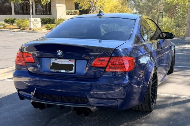 This 2009 BMW M3 coupe was purchased by the seller in 2011 and has 87k miles following registration history in Florida and California. Powered by a 4.0-liter V8 paired with a seven-speed dual-clutch transmission, the car is finished in Interlagos Blue Metallic over Silver Novillo leather upholstery. Equipment includes a limited-slip differential, xenon headlights, a carbon-fiber roof panel, rear parking sensors, heated front sport seats, dual-zone automatic climate control, and iDrive with navigation, while modifications include a Brembo brake kit, 19″ multi-spoke wheels, a Dinan intake, and an aftermark …