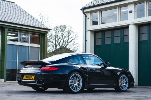 This 2011 Porsche 911 Turbo S coupe is a right-hand-drive, UK-market example that was purchased by its current owner in 2023, and its odometer now indicates 41k miles. Finished in Basalt Black Metallic over black leather upholstery, the car is powered by a twin-turbocharged 3.8L flat-six that drives all four wheels via a seven-speed PDK dual-clutch transaxle. Equipment includes 19″ RS Spyder center-locking wheels, carbon-ceramic brakes, a limited-slip rear differential, the Sport Chrono package, bi-xenon headlights, heated power-adjustable front seats, automatic climate control, Bose audio, and PCM infotainment with navigation. Service in June 2025 consisted of changing the oil, bleeding the b …
