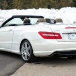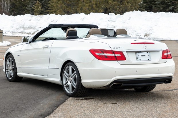 This 2012 Mercedes-Benz E550 is a Canadian-market cabriolet that was ordered with the Appearance, Driver Assistance, Premium 1, and Premium 2 packages, which together provided bi-xenon headlights with Active Curve Illumination, 18″ AMG split-spoke wheels, heated and ventilated multi-contour front seats, front Airscarf neck warmers, a Harman Kardon sound system, a rearview camera, Distronic Plus adaptive cruise control, Active Blind Spot Assist, Active Lane Keeping Assist, and Keyless Go keyless entry. The car was specified in Diamond White Metallic over Natural Beige leather, and additional details include a twin-turbocharged 4.6-liter V8, a seven-speed automatic transmission, a black soft top, Parktronic parking sensors, and multi-zone aut …