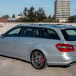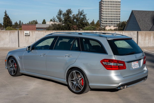 This 2012 Mercedes-Benz E63 AMG wagon has 34k miles following registration history in California, and it was optioned from the factory with the P30 Performance Package, which increased the engine’s rated output and increased the top speed limit to 186 mph as well as added an AMG sport suspension, an AMG performance steering wheel, and a carbon-fiber engine cover. Finished in Iridium Silver Metallic over black leather upholstery, it is powered by a twin-turbocharged 5.5-liter M157 V8 linked to a seven-speed MCT automatic transmission and a limited-slip differential. The car is further equipped with 19″ AM …