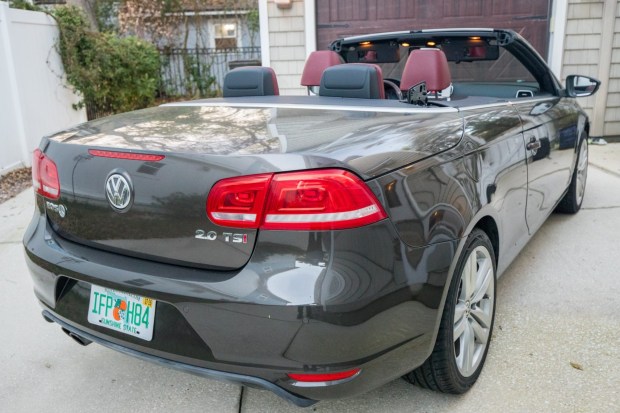 This 2012 Volkswagen Eos was ordered in the Executive trim level, which added a sport suspension, 18″ Kansas alloy wheels, an RNS 510 navigation system, and a Dynaudio sound system. Finished in Black Oak Brown Metallic over red leather and indicating 59k miles, the car was purchased in 2016 by the seller, who is the third registered owner, and additional details include a turbocharged 2.0-liter inline-four, a six-speed DSG automatic transaxle, a power-retractable hardtop with a panoramic sunroof, rear Park Distance Control parking sensors, heated power-adjustable front seats, Kessy keyless entry, and an aftermarket steering wheel. This Eos is now offered at no reserv …