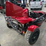 This 2013 Ariel Atom 3 is powered by a supercharged 2.0-liter Honda K20 inline-four that is linked with a six-speed manual transaxle and a limited-slip differential, and it has been equipped with a fabricated exhaust system, an adjustable rear wing, and body panels wrapped in red. The car rides on staggered-diameter multi-spoke wheels and adjustable coilovers with H&R springs, and other details include a single roll hoop, a front splitter, and exterior lighting. The cockpit houses a pair of bucket seats equipped with harnesses as well as a fire suppression system, drilled pedals, and a microsuede-wrapped steering wheel with an integ …