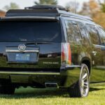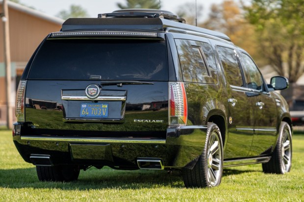 This 2013 Cadillac Escalade ESV Premium was upfitted as a mobile office by Becker Automotive Design for use by members of the Baltimore Ravens NFL football team. The length and height of the vehicle were increased to accommodate a revised seating configuration and a custom multimedia setup. A flat-screen TV is integrated into the partition that separates the rear cabin, which is outfitted with four captain’s chairs, burl wood veneer accents, a pair of tray tables, a custom sound system, privacy curtains, dimmable lighting, and power outlets. Other details include massage, heat, and ventilation functions for the rear pair of seats as well as an intercom system, a ref …