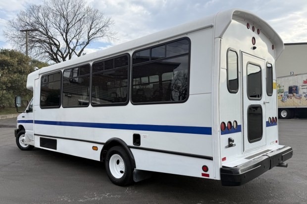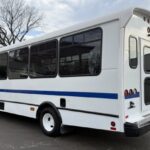 This 2013 Ford E-450 Super Duty was converted to a 24-passenger bus with a wheelchair lift by Champion Bus in Forest River, Michigan. It is powered by a 6.8-liter Triton V10 that drives the rear wheels through a five-speed automatic transmission and is finished in Oxford White over blue vinyl and cloth. Equipment includes 16″ eight-lug steel wheels, four-wheel disc brakes, a power-operated side entry door, a Recaro driver’s seat, a CD stereo, front and rear air conditioning, cruise control, and security cameras. Acquired by the seller in 2025, this E-450 passenger bus has 111k miles and is offe …