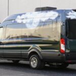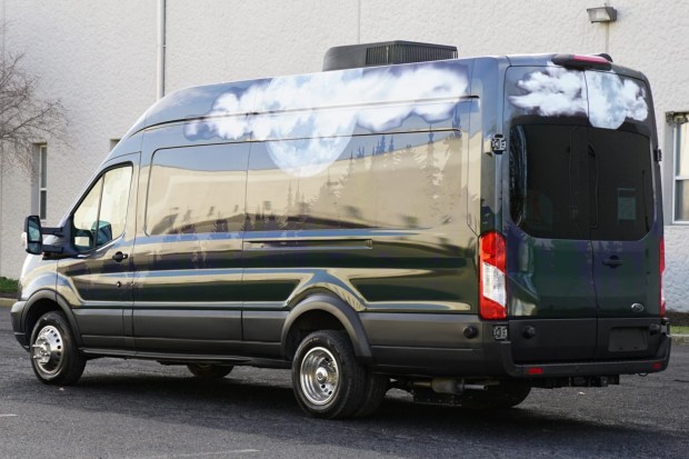 This 2018 Ford Transit 350 HR was modified for use as a mobile office under previous ownership and was acquired by the selling dealer in 2025. It has been outfitted with a power-operated awning, a generator, a roof-mounted air conditioner, a TV and sound bar, a desk area with underneath storage and a drawer-style refrigerator, overhead spotlights and ambient lighting, a swivel chair, and a two-person bench seat that is trimmed in orange fabric. The van rides on 16″ steel wheels, an independent front suspension, and a dually rear axle and is further equipped with tow mirrors, a po …