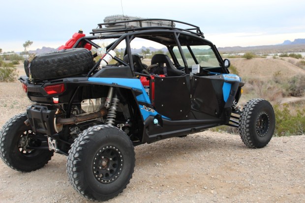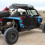 This 2018 Polaris RZR XP 4 Turbo is powered by a turbocharged 925cc twin linked with a passively variable automatic transmission and an on-demand all-wheel drive system, and it features blue bodywork over a black frame. The vehicle rides on black 15″ Method wheels with 32″ Tensor tires and is further equipped with Walker Evans shocks with Eibach springs, a Jimco long travel kit, an aluminum roof, FiberwerX doors, a skid plate, and Baja Designs front and rear LED light bars. The cockpit houses four Simpson Racing bucket seats that are accompanied by five-point harnesses, a helme …