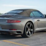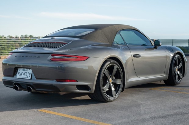 This 2018 Porsche 911 Carrera cabriolet was specified in Agate Gray Metallic over a Black and Bordeaux Red leather interior, and it is powered by a twin-turbocharged 3.0L flat-six paired with a seven-speed PDK automatic transaxle. The car was ordered with the Premium Package Plus and the Sport Chrono Package, which together offered the Light Design Package, Porsche Dynamic Light System Plus (PDLS+), Porsche Entry & Drive, a stopwatch, and heated and ventilated front seats. The front seats are also 14-way power-adjustable sport units, and further details include a sport exhaust system, a black soft top, ParkAssist parking sensors, matte black-finished 20″ Carrera Sport alloy wheels, and a Bose …