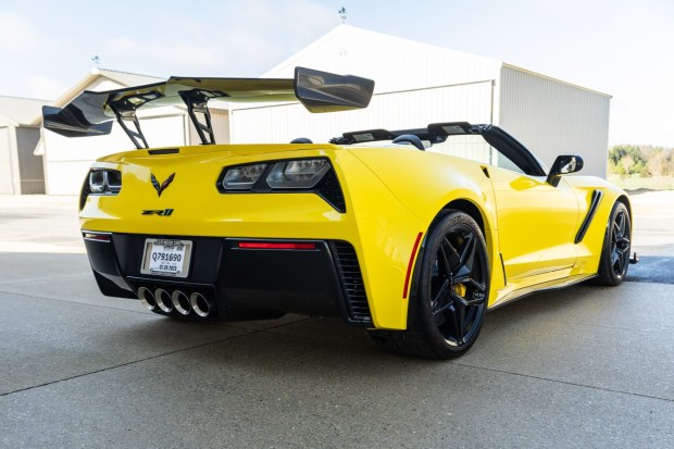 This 2019 Chevrolet Corvette ZR1 convertible was initially delivered to AutoNation Chevrolet West Colonial in Orlando, Florida, and was optioned with the 3ZR Premium Equipment Group and the Track Performance Package. Finished in Corvette Racing Yellow Tintcoat over Jet Black leather, it is powered by a supercharged 6.2-liter LT5 V8 linked with an eight-speed automatic gearbox and an electronic limited-slip differential. The car rides on Carbon Flash 19″ and 20″ 10-spoke wheels and is further equipped with carbon-ceramic brakes, Magnetic Ride Control, a black convertible soft top, xenon headlights, a rear wing, heated and ventilated Competition Sport bucket seats, curb-view cameras, a back-up camera, a head-up display, a per …