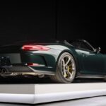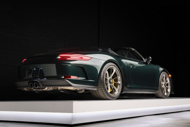 This 2019 Porsche 911 Speedster is #1,097 of 1,948 examples produced for the model year, and it was specified in paint-to-sample Forest Green Metallic over black leather upholstery. Power is provided by a 4.0-liter flat-six mated to a six-speed manual transaxle and a limited-slip differential. Equipment includes the Chrono package, 20″ center-lock alloy wheels, carbon-ceramic brakes, a front-axle lift system, a black soft top, a carbon-fiber convertible-top cover panel, a speed-activated rear spoiler, and LED headlights with PDLS as well as carbon-fiber full-bucket seats, automatic climate control, a Bose sound system, and Porsche Communication Managem …