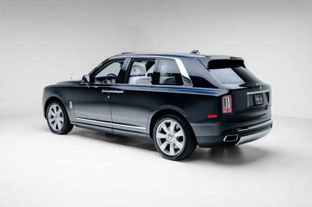 This 2020 Rolls-Royce Cullinan was specified with Sapphire Black Metallic paintwork, Chevron wood and two-tone blue leather interior trim, and Arctic White and blue leather upholstery. The cabin houses ventilated, heated, power-adjustable, and massaging front and rear seats along with front and rear climate control, a rear-cabin center console and picnic tables, lambswool floor mats, a head-up display, and a heated steering wheel. Power is provided by a twin-turbocharged 6.75-liter V12 that drives all four wheels via an eight-speed automatic transmission. Further equipment includes self-leveling air suspension, 22″ polished wheels, a panoramic sun …