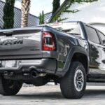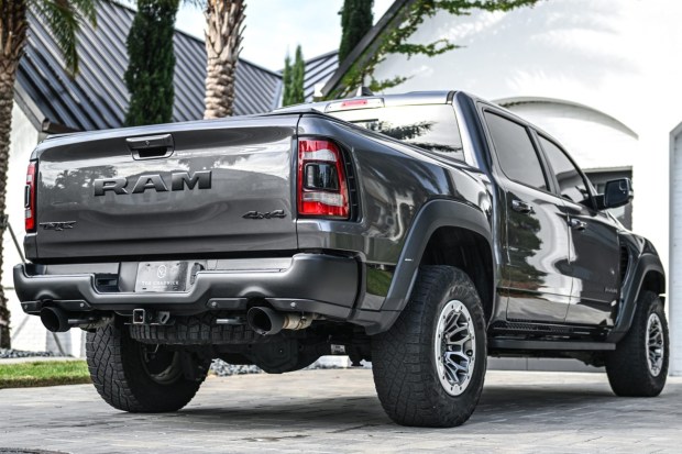 This 2021 Ram Ram 1500 TRX Crew Cab 4×4 was optioned with the TRX Level 2 Equipment Package and has 55k miles after time in Florida. Finished in Granite Crystal Metallic over black leather and microsuede, the truck is powered by a supercharged 6.2-liter Hemi V8 linked with an eight-speed automatic transmission, a full-time two-speed transfer case, and an electronically locking rear differential. Equipment includes a dual-panel sunroof, a folding tonneau cover, Mopar running boards, 18″ beadlock-capable aluminum wheels, Bilstein BlackHawk e2 adaptive dampers, heated and ventilated front and rear seats, power-a …