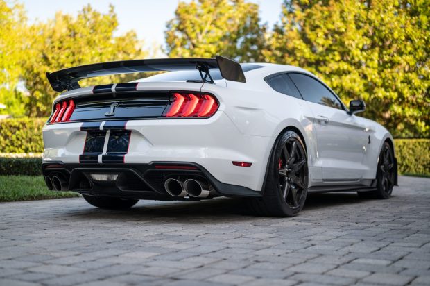 This 2021 Ford Mustang Shelby GT500 was optioned with over $31k of equipment, including the Carbon Fiber Track Pack, the Technology Package, and High-Gloss Kona Blue painted over-the-top stripes that accent the Oxford White finish. Purchased new by the seller out of California, the car was relocated to Florida and now has 1,700 miles. Power is provided by a supercharged 5.2-liter V8 linked with a Tremec seven-speed dual-clutch automatic transmission and a Torsen limited-slip differential. The car rides on carbon-fiber 20″ wheels and has Brembo brakes, adjustable strut top mounts, a MagneRide damping system, and a carbo …