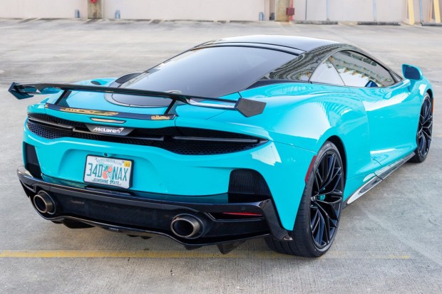 This 2022 McLaren GT was specified with MSO Defined Tokyo Cyan paint and was originally delivered to McLaren Boston in Norwell, Massachusetts. It was purchased by the seller in 2024 and has 7k miles. Power is supplied by a twin-turbocharged 4.0-liter V8 fitted with a Sports exhaust system, while shifting is through a seven-speed dual-clutch automatic transaxle. Riding on 20″ and 21″ gloss black 10-twin-spoke lightweight wheels and an adaptive suspension, the car is further equipped with a vehicle-lift system and carbon-ceramic disc brakes. Further appointments include black leather interior upholstery, body-color seat piping, the Premium Pack, a power-operat …