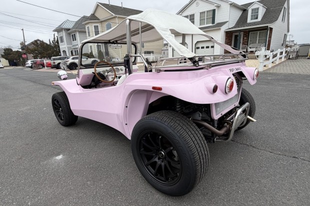 This 2022 Oreion Beach Buggy is powered by a rear-mounted 1.3-liter inline-four paired with a four-speed automatic transmission, and its fiberglass bodywork is finished in pink. The buggy rides on staggered-diameter wheels, and braking is handled by discs at all four corners. A white bikini top is mounted over a roll bar, and the cabin features front bucket seats and a rear bench seat upholstered in white vinyl. Equipment includes a Bluetooth stereo, front and rear three-point seatbelts, and a rear luggage rack. This Beach Buggy was purchased by the seller on BaT in October 2024, and it now has 367 miles. It is being offered …