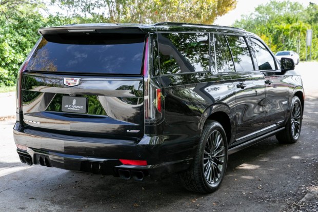 This 2023 Cadillac Escalade-V ESV is powered by a supercharged 6.2-liter V8 linked with a 10-speed automatic transmission, an all-wheel-drive system, and an electronic limited-slip differential. The truck is finished in Black Raven over Jet Black leather, and it was delivered new to Moore Cadillac in Chantilly, Virginia, with an optional Super Cruise semi-autonomous driving system. Additional features include 22″ 18-spoke alloy wheels, Air Ride Adaptive Suspension, Magnetic Ride Control, power-deployable running boards, leather-wrapped interior trim, an AKG sound system, a head-up display, a surround-view camera system, heated second-row captain’s chairs, and heated, ventilated, and power-adjustable front seats. This T1XL Escalade-V ESV has 11k miles and is now offe …
