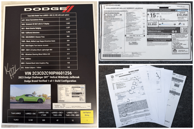 This 2023 Dodge Challenger SRT Hellcat Widebody Jailbreak was ordered new by the seller through Koons Dodge of Vienna, Virginia, and has since resided in his Dodge collection. It was specified from the factory in Sublime with the Painted Satin Black Graphics Package as well as low-gloss black 20″ lightweight wheels, yellow brake calipers, and black Nappa leather and Alcantara interior upholstery. Power comes from a supercharged 6.2-liter V8 linked to an eight-speed automatic transmission and a limited-slip differential, and further equipment includes HID Air-Catcher headlamps, adaptive Bilstein dampers, Brembo brake calipers, an Alpin …