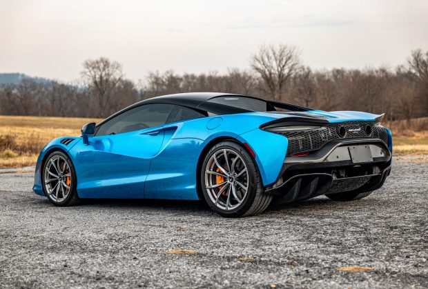 This 2023 McLaren Artura was originally delivered to Texas and spent time in Arizona and Nevada prior to its acquisition by the selling dealer in January 2026. The car is finished in Ludus Blue with a black roof over black Alcantara and leather upholstery. Power comes from a twin-turbocharged 3.0-liter V6 mated to an Axial Flux electric motor and an eight-speed dual-clutch transaxle. Additional equipment includes a 7.4-kWh lithium-ion battery, a front-axle lift system, carbon-fiber exterior and interior accents, forged alloy wheels, carbon-ceramic brake rotors, a Bowers & Wilkins sound system …