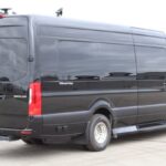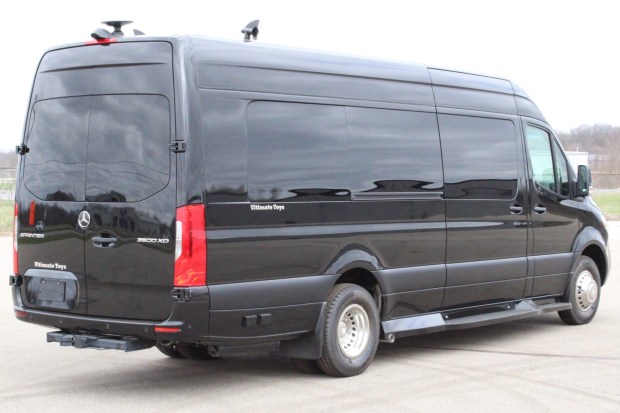 This 2023 Mercedes-Benz Sprinter 3500XC was upfitted by Midwest Automotive Designs of Elkhart, Indiana, as a 2024 Ultimate Toys Ultimate Coach and was acquired new by the selling dealer. Finished in Obsidian Black Metallic over beige upholstery, the van is powered by a 2.0-liter turbodiesel inline-four linked with a nine-speed automatic transmission. Equipment includes 16″ wheels with polished covers along with a dually rear axle, a high roof, Parktronic, a rearview camera, a hitch receiver, and tanks for fresh and waste water. Inside, six captain’s chairs are accompanied by two benches, MBUX infotainment, automatic climate control, …