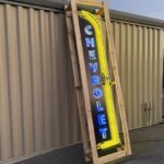 This neon sign is a single-sided reproduction piece with white Chevrolet lettering and twin yellow accent stripes on its black face. Blue and yellow neon tubing illuminates the sign, which measures approximately 8 feet tall by 20″ wide. Pre-drilled mounting tabs are integrated into the back of the enclosure, and 120-volt power comes from three cords with US-style wall plugs. This Chevrolet sign was acquired by the seller in 2026 and is now offered at no reserve in Niagara Falls, New York, with a wooden shipping crate.
