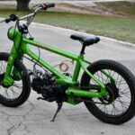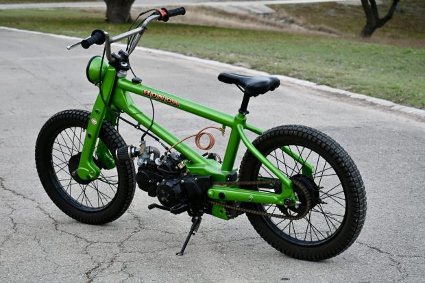 This custom scooter features a hardtail frame that is finished in metallic green with Honda decals, and it is powered by an aftermarket air-cooled 125cc single paired with a four-speed manual transmission. Equipment includes an electric starter, a Keihin carburetor, a slash-cut exhaust outlet, a Honda Super Cub–sourced leading-link fork, drum brakes, 17″ laced wheels, in-frame fuel storage, a yellow-tinted headlight lens, a cross-braced handlebar, an Odyssey bicycle-style saddle, serrated foot pegs, and a side stand. This custom scooter is offered in Texas on dealer consignment for off-roa …