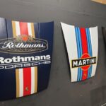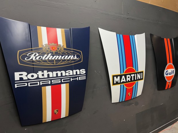 This wall display consists of three Porsche 911 hoods featuring Rothmans, Martini, and Gulf-style liveries applied as 3M vinyl wraps. Sourced from 1974–1989 model-year vehicles, the hoods are also adorned with Porsche crests. This Porsche 911 hood display is now offered at no reserve in Martinez, California, and includes a shipping crate for all three hoods.