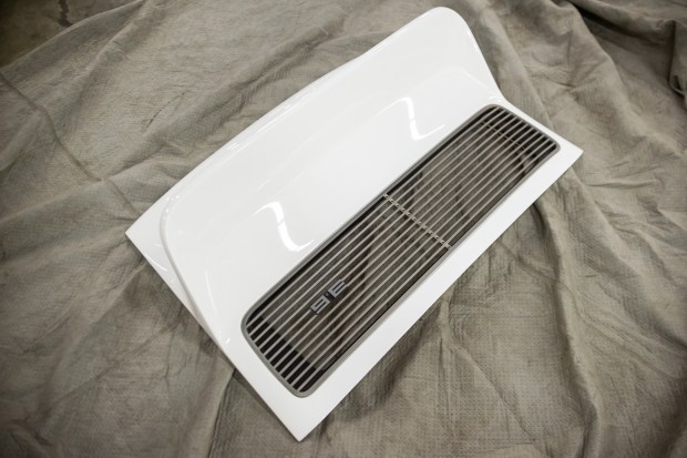 The piece is constructed of fiberglass and has been repainted in white. A 3.6 badge is affixed to the grille.