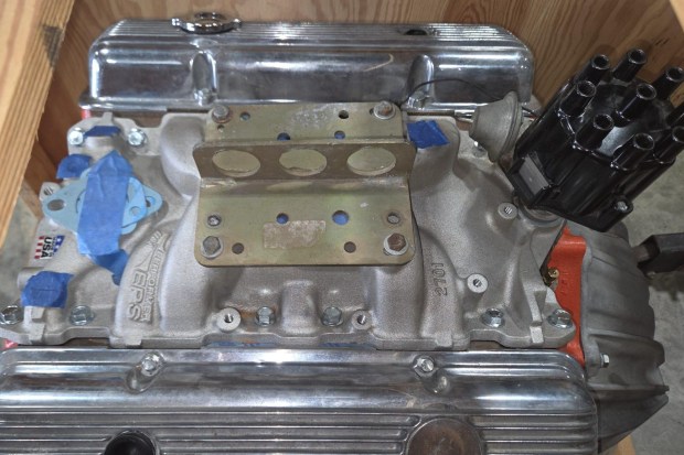 The seller notes that the engine has 186 cylinder heads and an 8″ harmonic balancer. It is fitted with an Edelbrock Performer EPS intake manifold and a modern distributor.