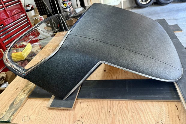 A removable hardtop was available for convertibles throughout second-generation Corvette production, and vinyl-covered tops were offered in 1967. This example has a black vinyl exterior covering, bright trim that frames the rear window and wraps around the front of the top, and a Plexiglas rear window.
