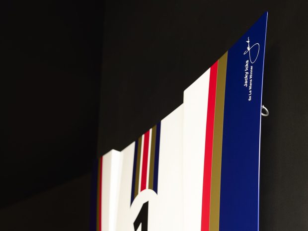 The seller states that the hood is a factory Porsche component that was hand-wrapped and inspired by the 1983 Porsche 956 raced by Jacky Ickx, a six-time winner of the 24 Hours of Le Mans. A vinyl rendering of his signature also appears on the hood. The seller further notes that the design was not printed but was hand-applied in sections by a French artist.