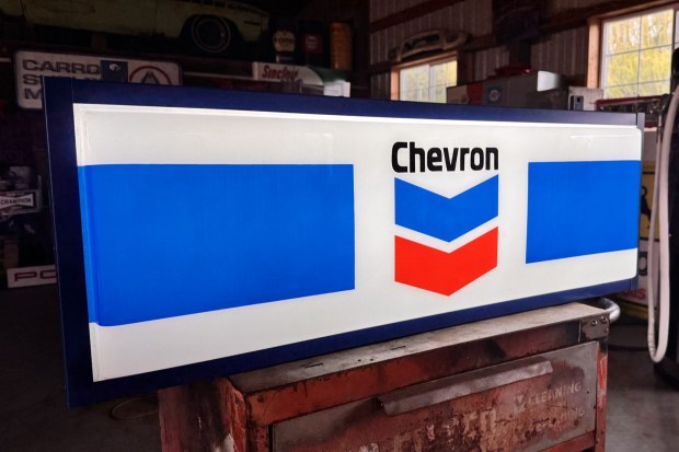 This illuminated single-sided rectangular Chevron sign features the red and blue company logo below black company script on a white translucent background with a pair of blue stripes. The sign measures approximately 39″ tall by 14″ wide, and has a metal frame that is finished in blue. LED fixtures using 120-volt circuitry were retrofitted to the sign after the selling dealer’s 2025 acquisition in Europe, along with a replacement power cord with an inline on/off switch. This illuminated Chevron sign is offered at no reserve in Salem, Oregon.