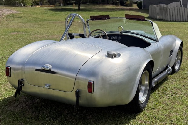 This Kirkham Motorsports 427/SC is powered by a side-oiler V8 that is said to have been modified to displace 482ci and mated to a David Kee Toploader four-speed manual transmission and a limited-slip differential. It features a brushed aluminum body with a hood scoop, a single stainless steel roll hoop, quick-jack-style bumpers, and side-exit exhaust pipes, while the interior houses a wood-rimmed steering wheel, black leather upholstery, a fire extinguisher, AutoMeter instruments, and latch-and-link lap belts. The car rides on a four-wheel independent suspension with Penske adjustable coilovers as well as knock-off 15″ Halibrand-style wheels and al …
