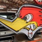 White, red, and yellow neon fixtures accent the single-sided character sign, which is powered by 120-volt circuitry. The piece measures approximately 55″ wide by 31″ tall and 6.5″ deep, and it weighs about 30 pounds.